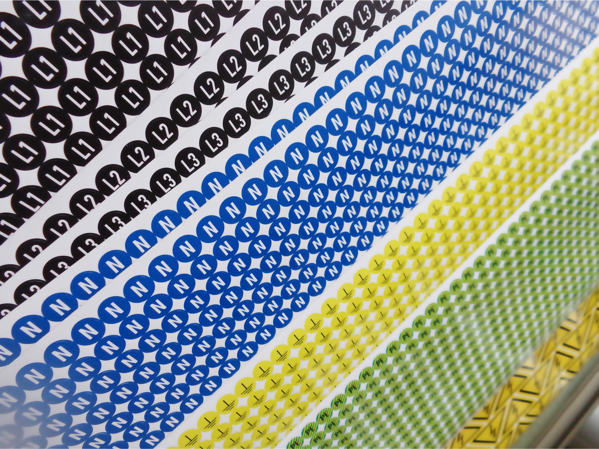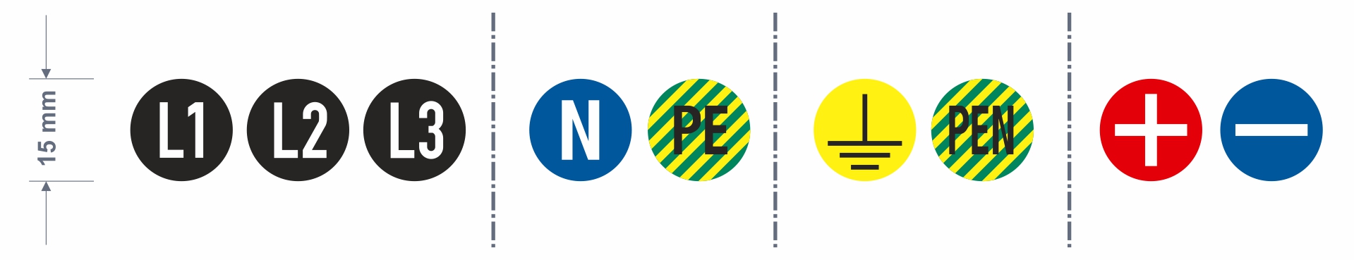 U ponudi su fazne oznake L1, L2, L3, N, PE, PEN, +, –, kao i oznake za uzemljenje i upozorenja „Opasnost – visoki napon“ u više varijanti, odnosno sve oznake po vašem zahtevu i potrebama.